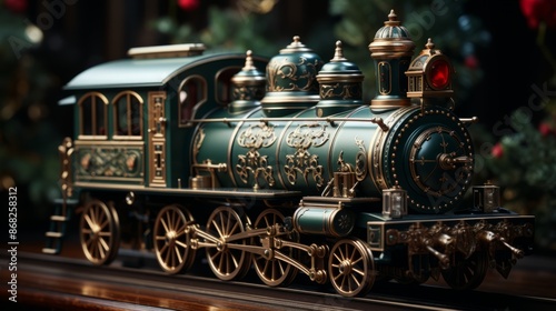 © Darcraft, Fototapeta premium A vintage green and gold toy train sits on a wooden table next to a decorated Christmas tree.