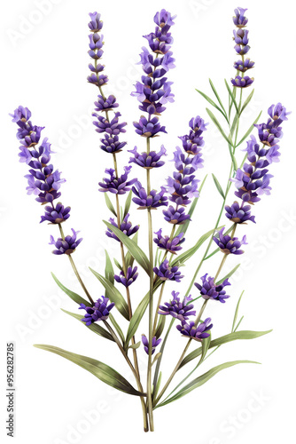 © GreenMOM, Naklejka premium A vintage illustration of Lavender flowers with lush green leaves, perfect for botanical themes and nature-inspired designs,PNG transparent background