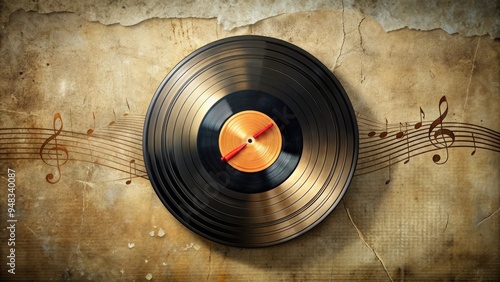 Obraz premium A vintage-inspired circular vinyl record with a stylized sound wave logo at its center, set against a distressed textured background with subtle music notes.