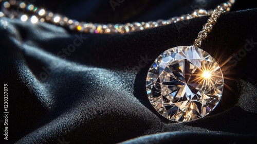 © Boonnam Burart, Fototapeta premium A vintage necklace with a large diamond centerpiece, placed on a dark velvet cloth, the light reflecting off the diamond's facets