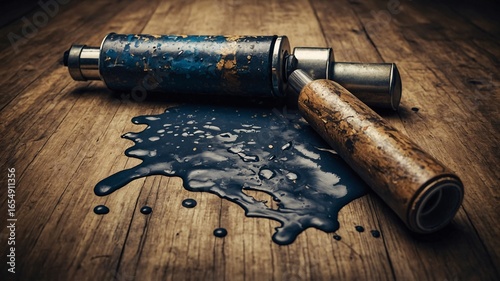© Liera, Obraz premium A vintage paint roller covered in blue paint rests on a wooden surface, with paint splatters adding texture.