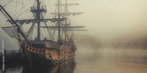 Fototapeta premium A vintage ship docked in a foggy harbor, creating a mysterious and serene...