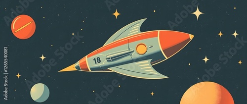 © Danial, Naklejka premium A vintage space wallpaper featuring a retro-styled rocket ship with detailed chrome and fins, flying across a starry night sky, designed in a mid-century modern aesthetic using mut.