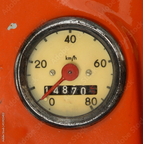 © Mr Doomits, Obraz premium A Vintage Speedometer On A Red Scooter