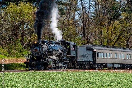 Obraz premium A vintage steam locomotive chugs along a green field, releasing thick smoke...