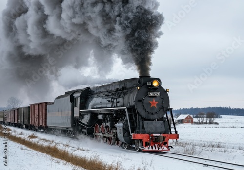 © Maxim Chaploutskiy , Obraz premium A vintage steam locomotive chugs through a snowy landscape, emitting thick black smoke into the cold air