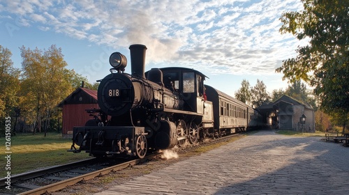 © gentho, Obraz premium A vintage steam locomotive parked on tracks near a rustic station in a scenic landscape.