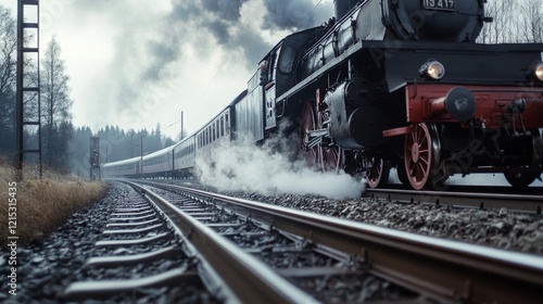 © VK Studio, Fototapeta premium A vintage steam locomotive powers along the railway, trailing billows of smoke against an overcast sky, evoking a sense of nostalgia and adventure.