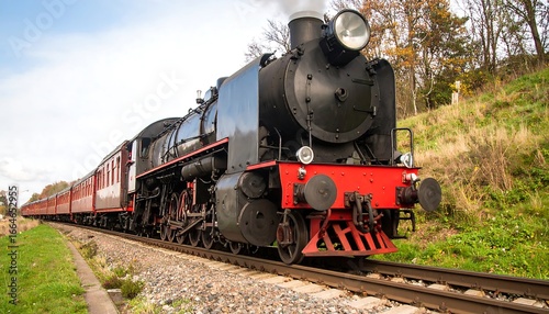 © Harumus, Naklejka premium A vintage steam locomotive pulls a passenger train along a rural track, steam billowing from its engine, showcasing the beauty of classic rail travel.