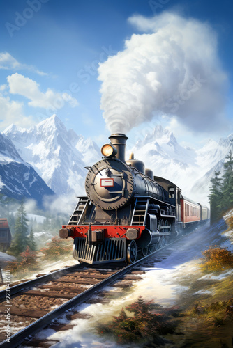 Obraz premium A vintage steam train chugs through a scenic snowy mountain landscape,...