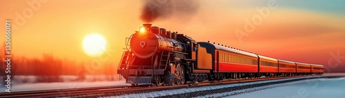 © Mnt, Naklejka premium A vintage steam train travels through a snowy landscape at sunset.