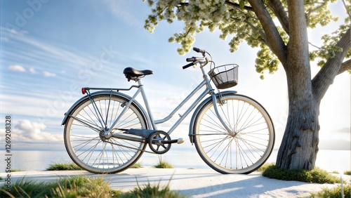 © VAshowcase, Obraz premium A vintage-style bicycle stands elegantly by a flowering tree, basking in the soft afternoon light.