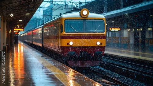 © QITIAN, Fototapeta premium A vintage train waits at the rainy platform during a stormy afternoon.