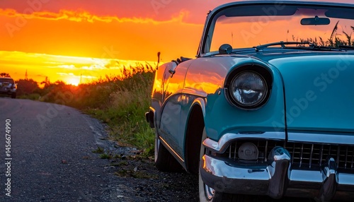 © SolaruS, Fototapeta premium A vintage turquoise convertible parked on a road with a vibrant sunset. Evokes nostalgia, freedom, and classic style. Perfect for travel, automotive, or retro themes.