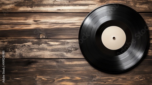 Obraz premium A vintage vinyl record rests on a rustic wooden background.