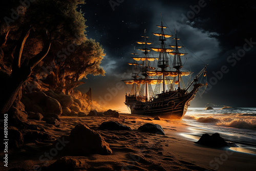 Obraz premium A vintage wooden ship moored to the shore at sunset. Generated by artificial...
