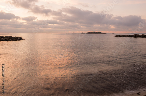 Fototapeta premium A violet sunrise on the beach of Ses figueretes, Ibiza