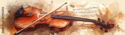 Fototapeta premium A violin and its bow are on a sheet of music, illustration fiddle and musical...