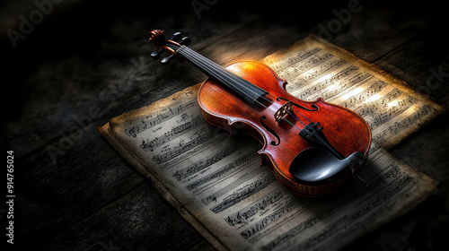 Naklejka premium A violin is on top of sheet music. The sheet music is old and has a worn look...