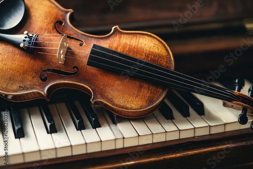 © Zahirah, Fototapeta premium A violin on the grand piano with generative ai