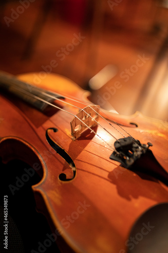Fototapeta premium A violin or a viola on a black chair. A classical string instrument common to symphony orchestra.