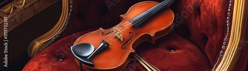 Fototapeta premium A violin rests elegantly on a plush red chair, showcasing its craftsmanship...