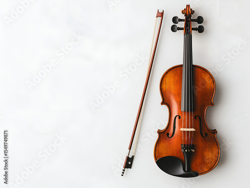 © Rattanapon, Fototapeta premium A violin with a bow resting beside it isolated on a white background