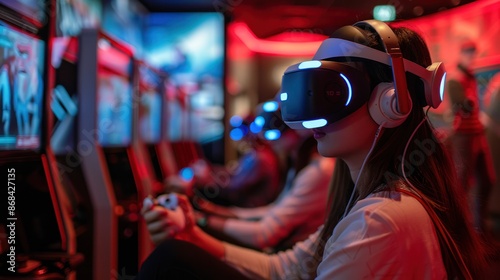 © Attasit, Obraz premium A virtual reality arcade with players immersed in games