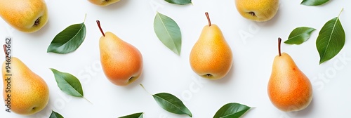 © kinara art design, Obraz premium A visually appealing arrangement of pears and leaves on a white background.