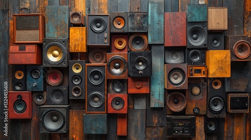 © Sang, Obraz premium A visually captivating wall of diverse vintage audio speakers suggests a powerful sound system for music enthusiasts and audiophiles.