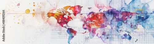 © Thi, Naklejka premium A visually striking global watercolor map adorned with overlaid digital analysis data