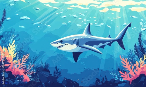Obraz premium A visually striking underwater scene featuring a shark swimming among vibrant...