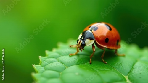 © Nova, Fototapeta premium A Vivid Close-Up of a Ladybug Perched on a Lush Green Leaf in a Serene Natural Setting