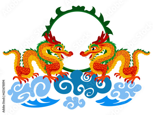 © Svetlana, Obraz premium A vivid concept of a Japanese fantasy festival dragon. Two dragons on clouds with a frame. Cartoon dragons in juicy colors for a holiday on a white background. Oriental theme of the holiday