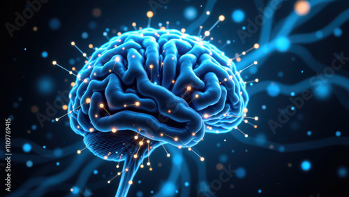 © Tameem, Fototapeta premium A vivid graphic of a human brain with AI highlighted by blue lights and particles.