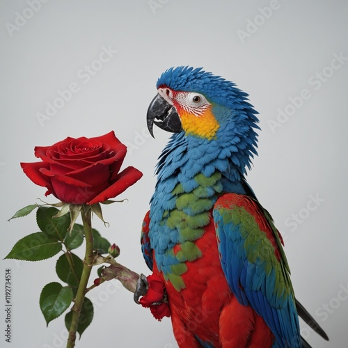 © Ejaz, Obraz premium A vivid, multicolored parrot with a bright blue tail, holding a red rose between its claws, all captured on white.