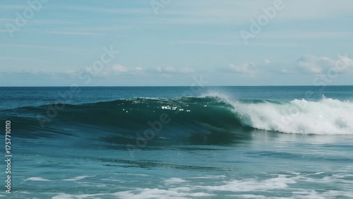 Fototapeta premium A vivid ocean wave is rolling with white foam, under a clear sky, showcasing...