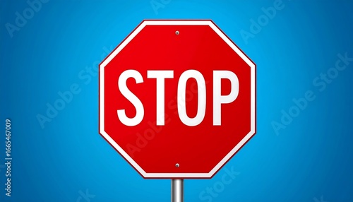 © ramangan, Obraz premium A vivid octagon-shaped stop sign, bold red with white lettering, stands out against a plain, gradient-blue background.