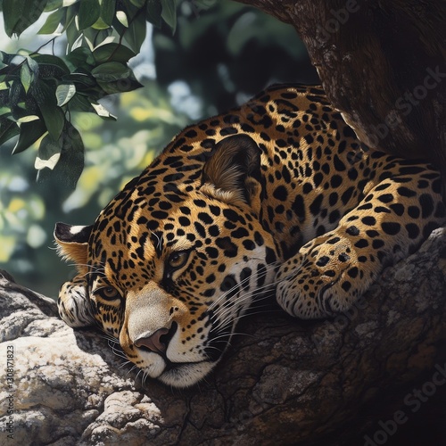 Fototapeta premium A vivid oil painting captures a serene jaguar perched on a tree branch, its...