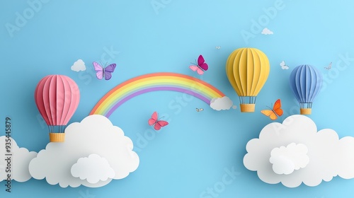 © Bundi, Fototapeta premium A vivid paper cut sky with clouds, a hot air balloon, and a rainbow landscape background.