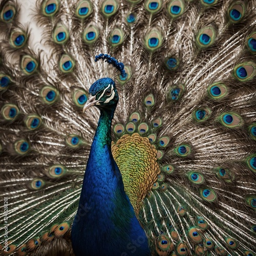 Naklejka premium "A vivid peacock surrounded by an intricate pattern of feathers against a...