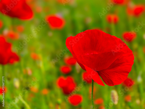© Moneynetar , Naklejka premium A vivid photograph of a blooming red poppy field in summer, showcasing the beauty of wildflowers in their natural habitat. The close-up detail and lush green background highlight. Stock photography