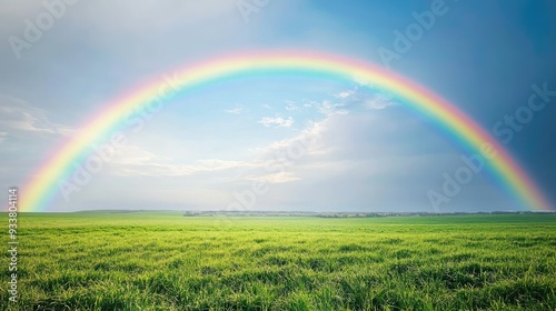 Obraz premium A vivid rainbow arcing above a sprawling green field, with a soft blue sky,...