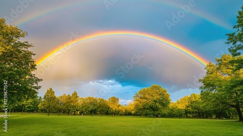 Naklejka premium A vivid rainbow stretches across the sky, arching over a park with green...