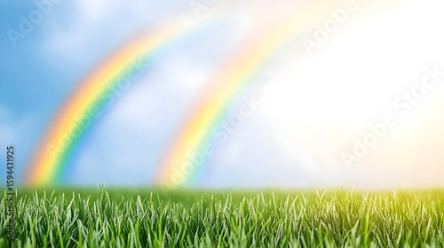 © mehmood, Naklejka premium A vivid sunset accompanied by a double rainbow above a verdant meadow