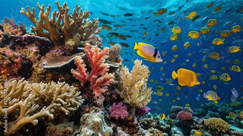 Fototapeta premium A vivid underwater scene features a rich coral reef bustling with an array of...