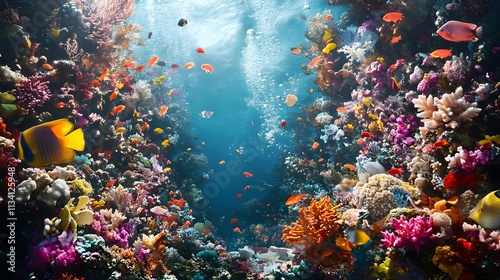 © Liang, Naklejka premium A vivid underwater scene showing a dying coral reef surrounded by colorful sea creatures, illustrating the effects of ocean pollution and climate change on marine ecosystems