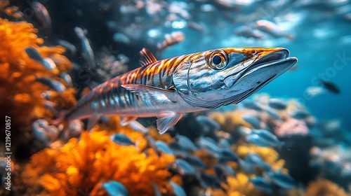 © Premium Resource, Fototapeta premium A vivid underwater shot of a barracuda hunting in a school of fish