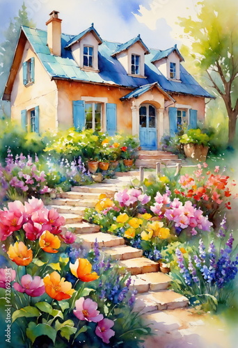 © vladnikon, Naklejka premium A vivid watercolor painting of a picturesque villa surrounded by a lush, blooming garden, creating a serene and inviting atmosphere.