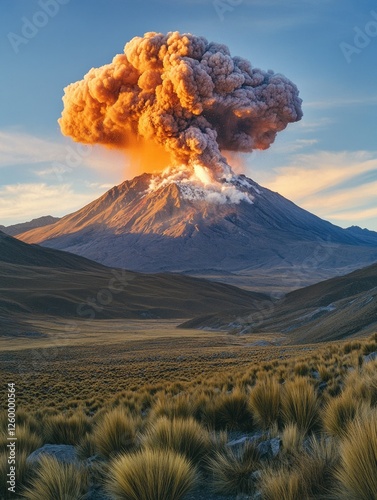 © Oleg, Obraz premium A volcanic eruption at sunset with a red sky.